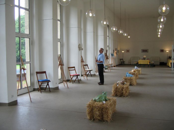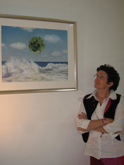 Zu den Bildern will ich nicht so viel sagen. Für diejenigen die meine Bilder heute zum ersten Mal sehen, einige wenige Erläuterungen zur Technik: Ich verwende für meine Bilder farbige weiche Pastellkreiden auf getöntem Papier. Das ermöglicht mir die pudrige Farbigkeit der Gegenstände. Themastisch faszinieren und begeistern mich nach wie vor Alltagsgegenstände wie Obst und Gemüse. Aber seit einiger Zeit reizt es mich zunehmend, die Gegenstände in Landschaften erscheinen zu lassen. Oder ich male Landschaften (meist das Meer) und es erscheinen Gestalten und Gegenstände!
